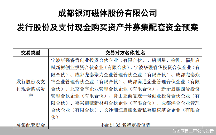 预案显示,银河磁体拟通过发行股份及支付现金的方式购买京都龙泰100%股权。另外,银河磁体拟向不超过35名符合条件的特定投资者,以询价方式发行股份募集配套资金。经交易各方初步协商,本次交易标的预估值约为4.5亿元。本次交易预计不构成重大资产重组、不构成重组上市、不构成关联交易。